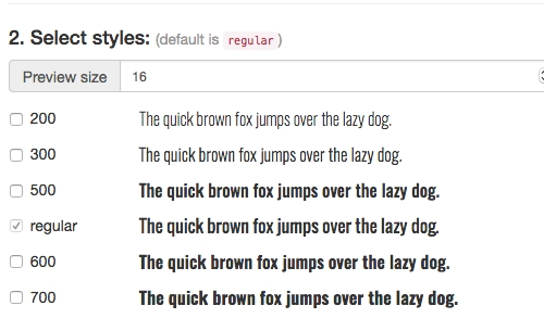 Beispiel https://google-webfonts-helper.herokuapp.com/fonts 1. Wählen Sie links im Menü ihre gewünschte Schrift aus 2. Wählen Sie nur einen Style aus z.B. Regular