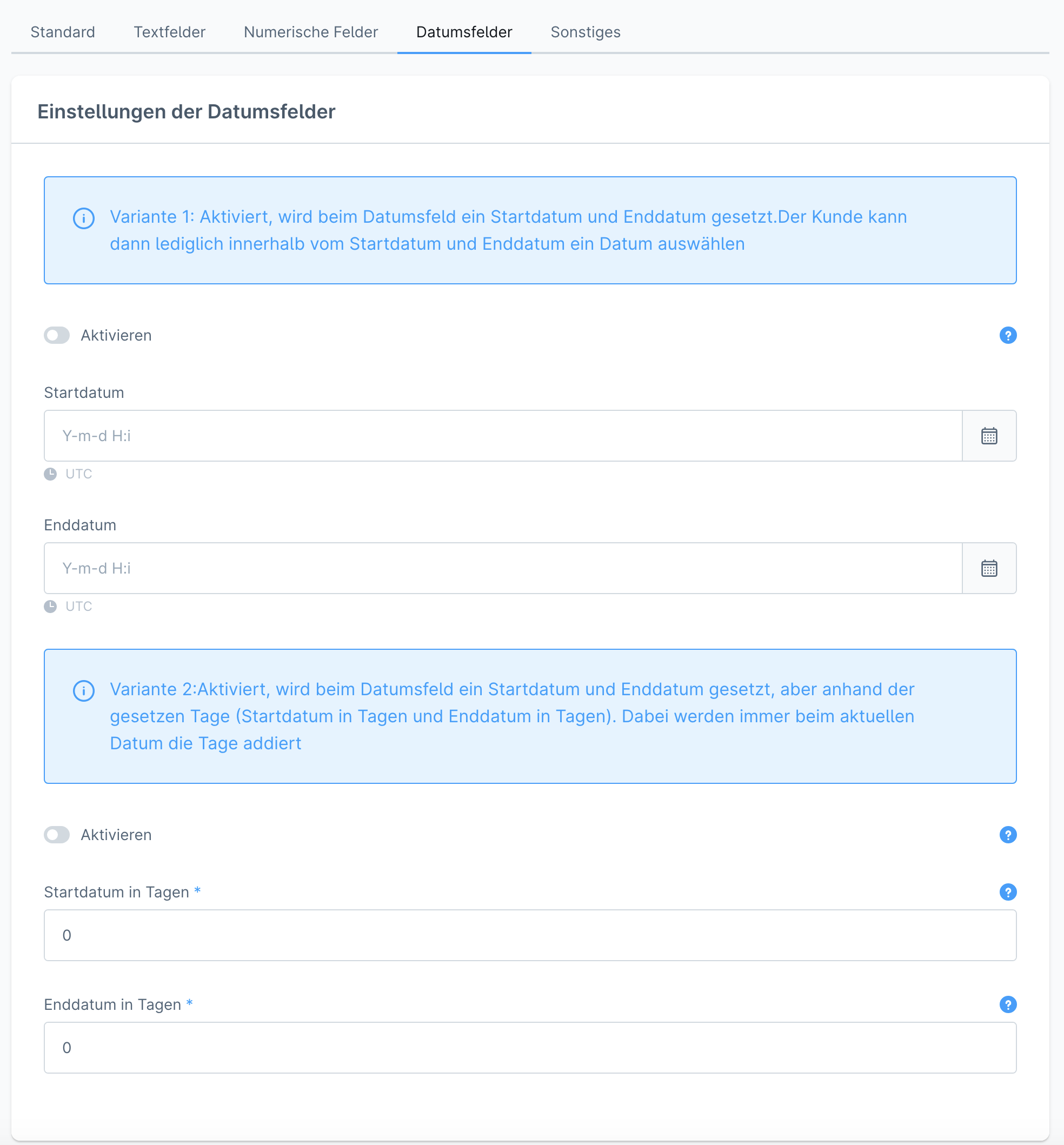 Aktiviert, wird beim Datumsfeld ein Startdatum und Enddatum gesetzt.Der Kunde kann dann lediglich innerhalb vom Startdatum und Enddatum ein Datum auswählen